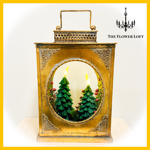 This beautiful golden metal lantern is filled with a beautiful scene of artificial greenery and illuminated with evergreen tree shaped candles. Candles are controlled by remote and can easily be removed for seasonal decoration.
