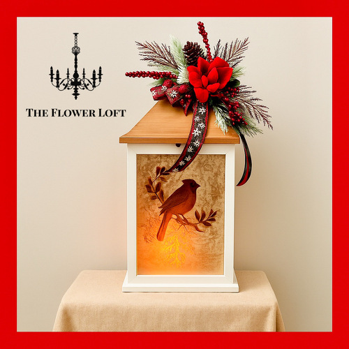 A tall wooden and glass lantern with beautifully designed cardinal on all four sides as well as silk floral embellishments. The lantern is illuminated by a rechargeable, remote controlled flickering flame unit, giving it a realistic flame effect from inside the lantern.