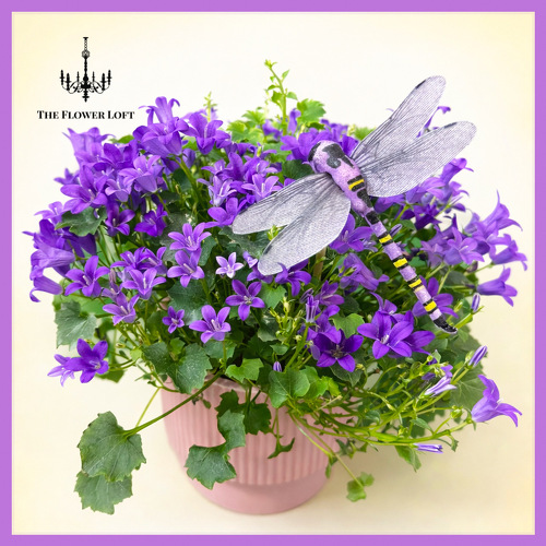 A charming burst of violet blooms, this lush campanula plant brings a touch of springtime whimsy to any space. Nestled in a 4inch soft pastel planter and accented with a delicate dragonfly, its vibrant star-shaped flowers create a cheerful display perfect for a windowsill, desk, or thoughtful gift. Easy to enjoy and full of color, it’s a lovely way to brighten someone’s day.