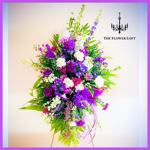 An elegant spray featuring beautiful blooms in almost every shade of purple with white floral accents. Flower varieties may vary based upon their availability.