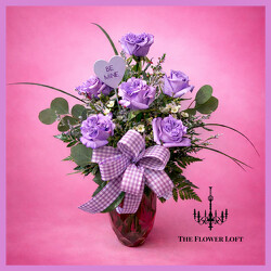 A twist on the traditional. A half dozen roses (Pink or Purple) designed in a unique vase with beautiful accents and a stunning design. Definitely tells you r significant other that they are always on your mind!